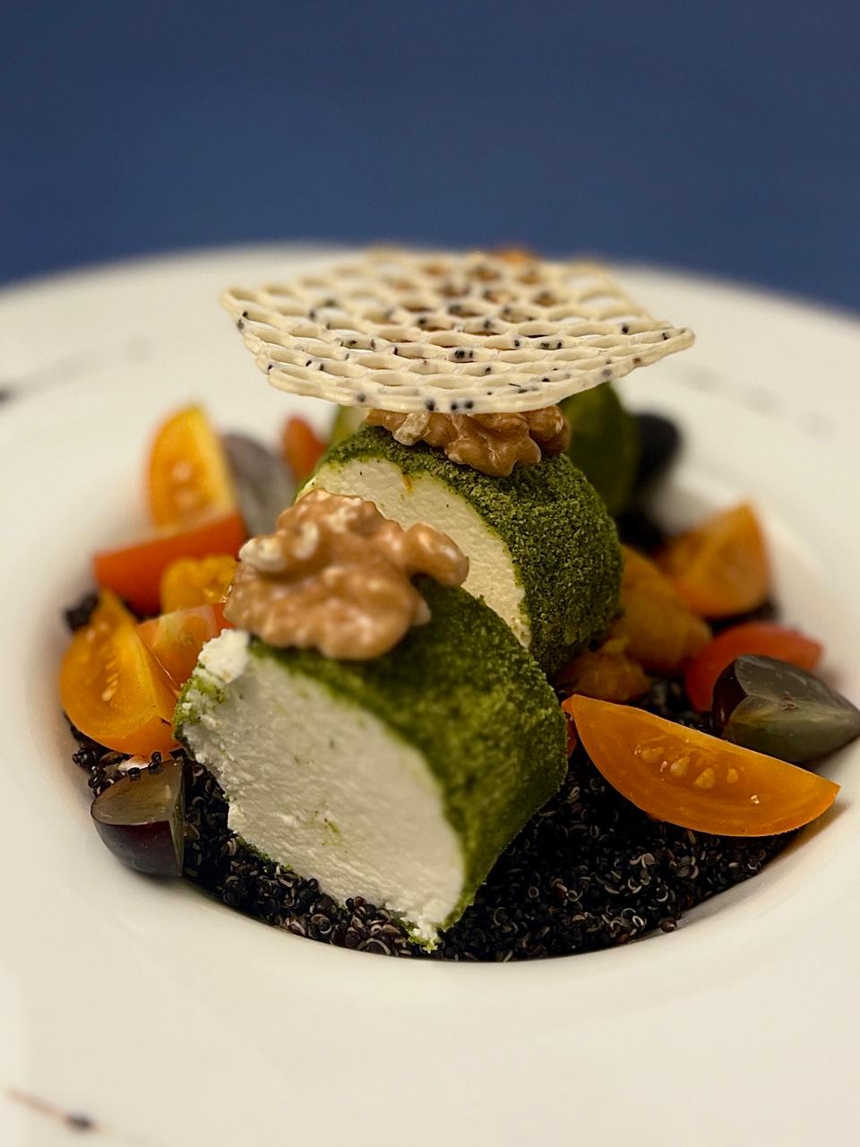 Served with coated goat cheese walnuts .