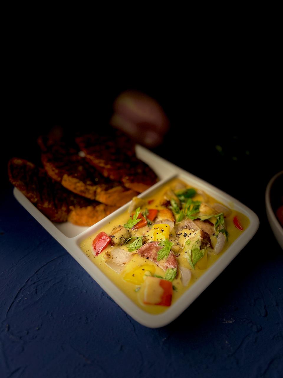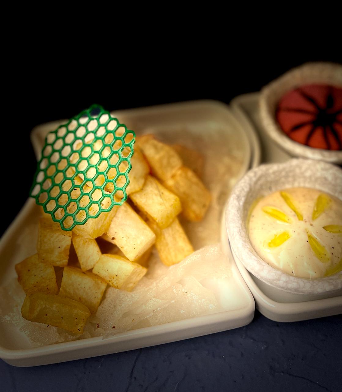 Served with fried potato bed with Sriracha sauce.