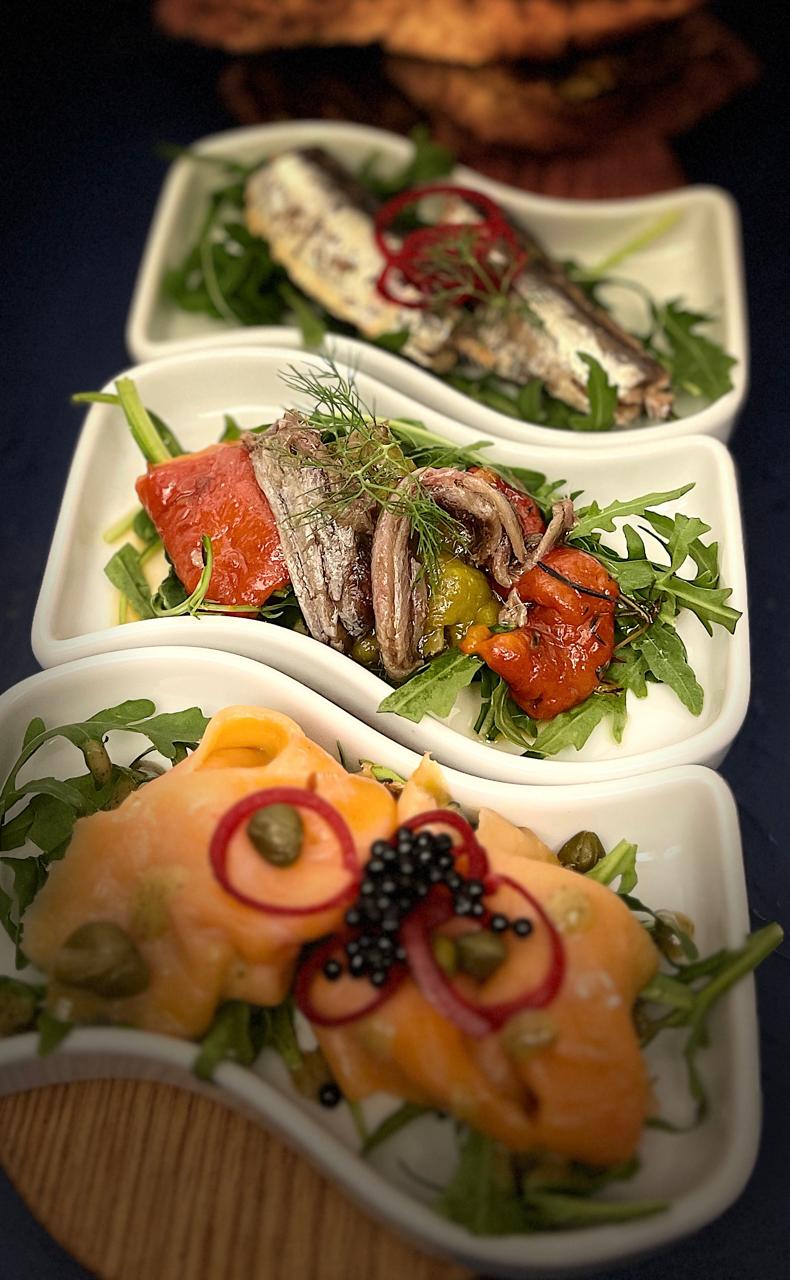 Anchovies in cherry vinegar. Salmon with bell peppers . Baby sardines with buttery mustard & rocket.