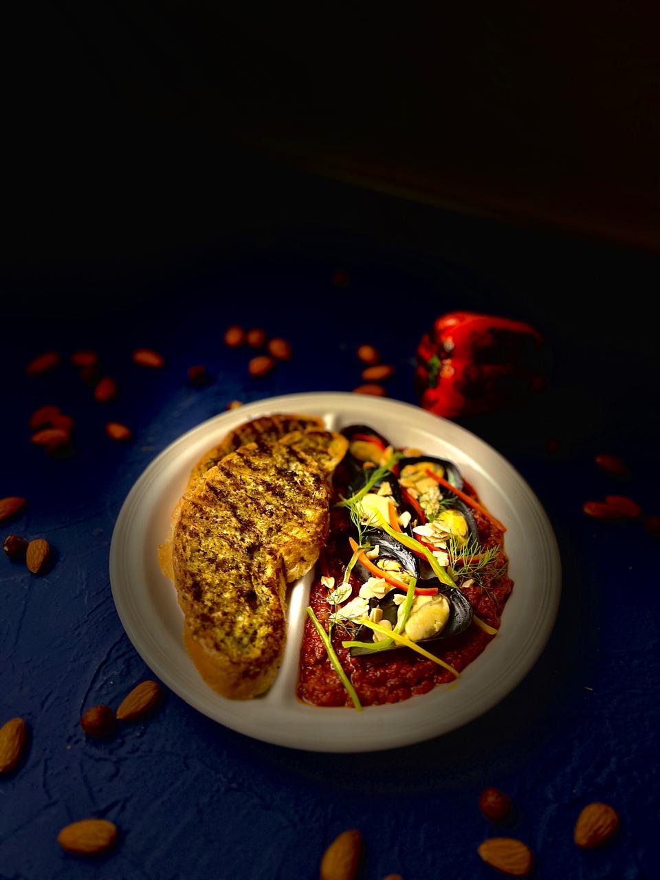 With romesco sauce and garlic bread.